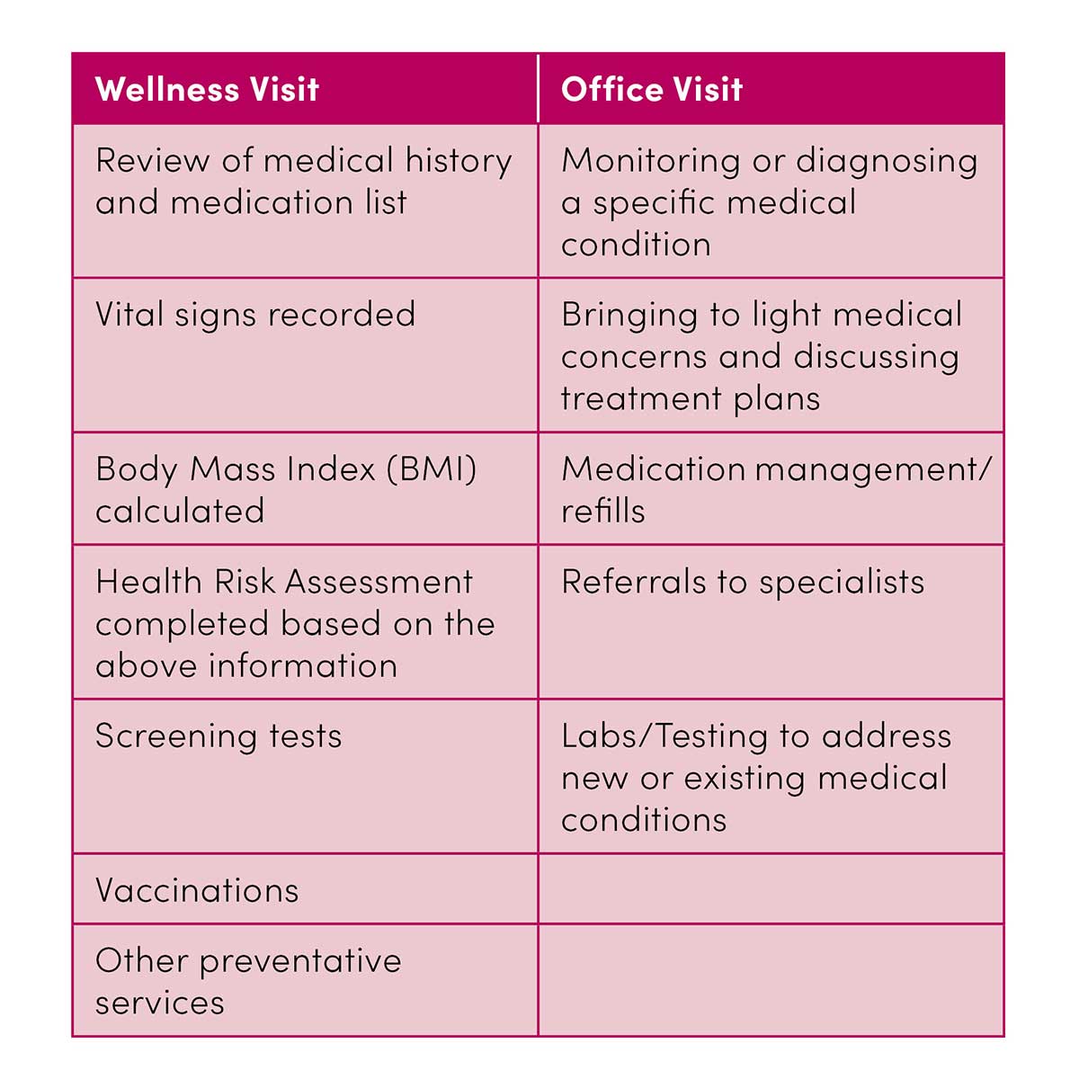 Whether meeting with your provider for the first time or the 100th time, it helps to be prepared. You can expect standard questions about your health history including current medical conditions, family medical history, allergies, prior surgeries, previous providers, etc. If there are certain symptoms you’d like to cover with your provider, make sure to note them as a topic to discuss. Come to your appointment armed with knowledge and confidence. Most insurance plans cover a regular checkup free of charge, so staying on top of your health comes at no extra cost to you!