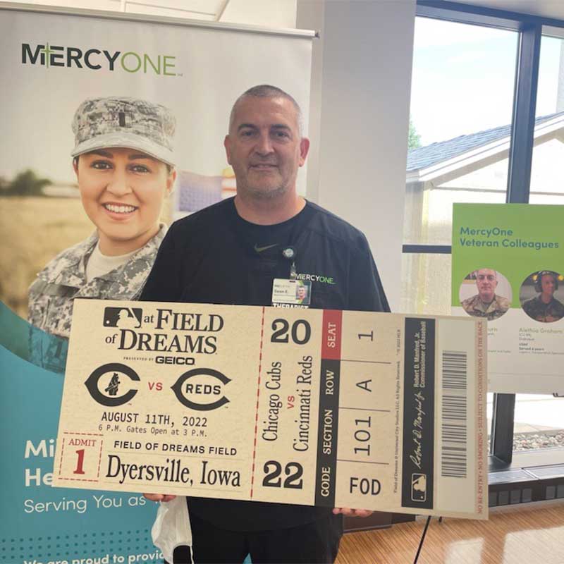 Sean Edaburn of Dundee, Iowa, is a respiratory therapist at MercyOne and continues to serve as a sergeant first class in the United States Army. One of his most memorable deployments was to recover vehicles that had broken down on missions or had been disabled by roadside bombs in Iraq. During his year-long deployment, which included 146 combat missions, he drove over 8,000 miles and his team recovered 42 vehicles without any injuries or loss of equipment.